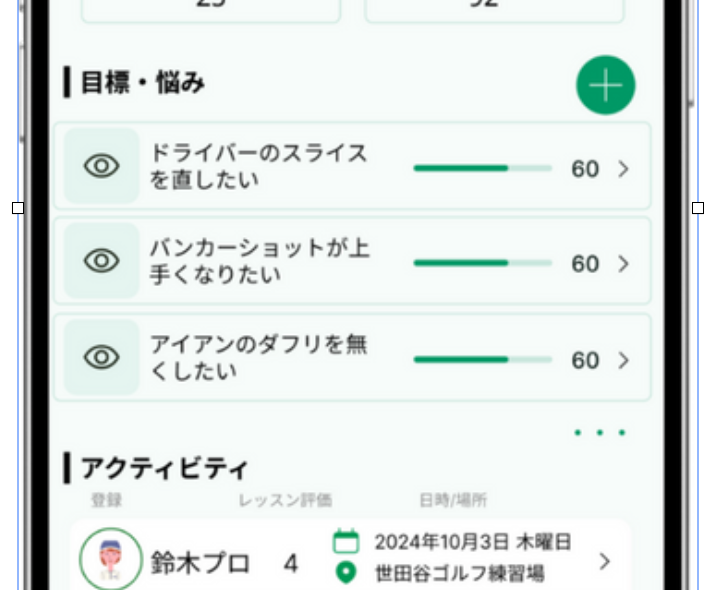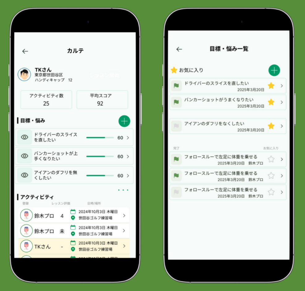 悩みや目標を登録して、その進捗を見ることができる。自主練習の内容を記録できたり、レッスンプロからのフィードバックも確認できる。